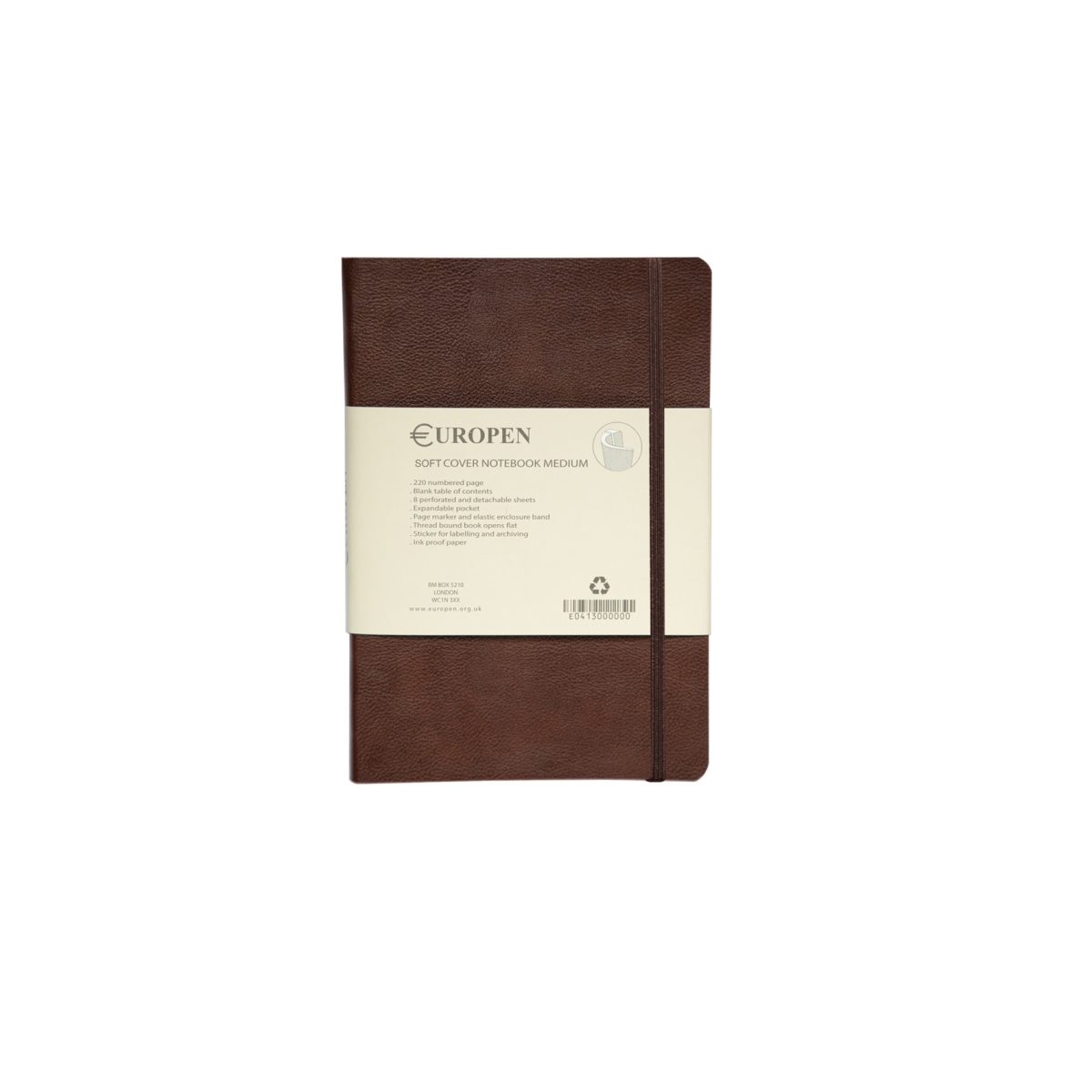 دفتر یادداشت مدل (SOFTCOVER MEDIUM) یوروپن با فرم صحافی عمودی و چسبی خود از جلدی انعطاف پذیر از جنس چرم به ابعاد (208×144) میلی متر و رنگ بندی متنوع (مشکی، قهوه ای، نسکافه ای و سورمه ای) طراحی و تولید شده است، این دفتر یادداشت حاوی تعداد 220 صفحه شماره دار بوده و صحافی آن بصورت چسبی و با دوخت ویژه انجام گرفته که امکان باز شدن 180 درجه ای دفتر را می دهد.