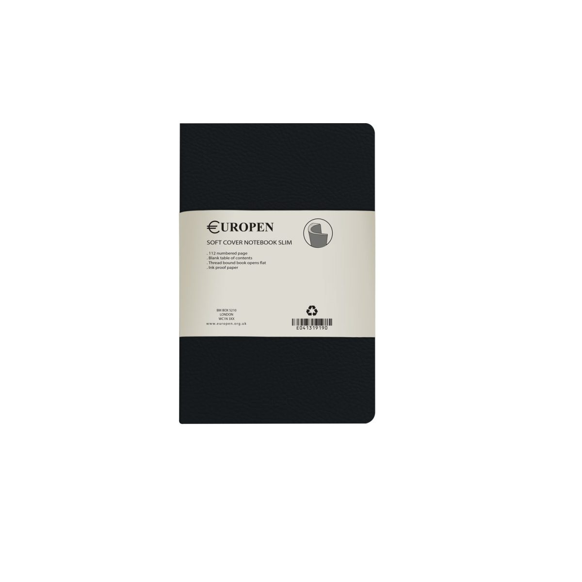 دفتر یادداشت مدل (SOFTCOVER SLIM) یوروپن در ابعاد (208×144) میلی متر و با ویژگی هایی همچون نوع صحافی چسبی با فرم عمودی شکل، جلدی انعطاف پذیر از جنس چرم و رنگبندی متنوع (مشکی، طوسی، بنفش، صورتی تیره، نارنجی تیره، نارنجی روشن، سبز روشن، سبز تیره، یاسی، قهوه ای و کرم تیره) طراحی و تولید شده است، این دفتر یادداشت حاوی تعداد 112 صفحه شماره دار بوده و نوع صحافی آن بصورت چسبی و با دوخت ویژه است که امکان باز شدن 180 درجه ای و تا شدن 360 درجه ای دفتر را می دهد.